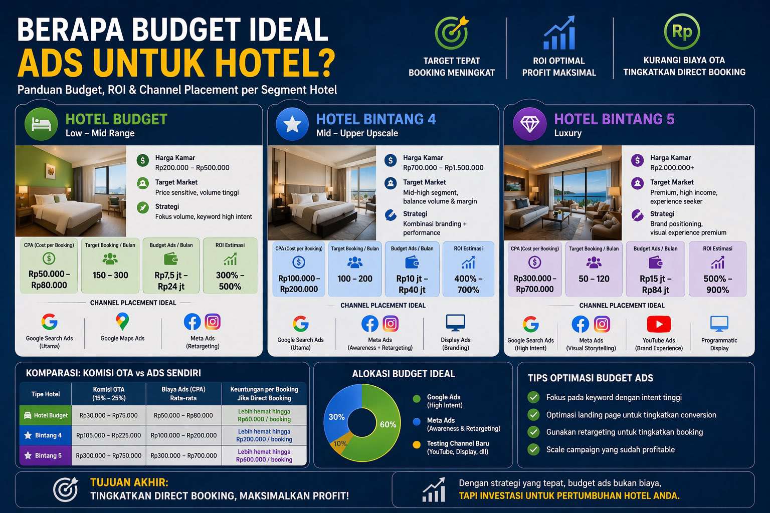 Menentukan budget ads untuk hotel tidak bisa menggunakan pendekatan generik. Setiap tipe hotel memiliki target market, harga kamar, dan strategi marketing yang berbeda. Oleh karena itu, budget harus dihitung berdasarkan potensi revenue, cost per acquisition (CPA), dan channel yang digunakan.