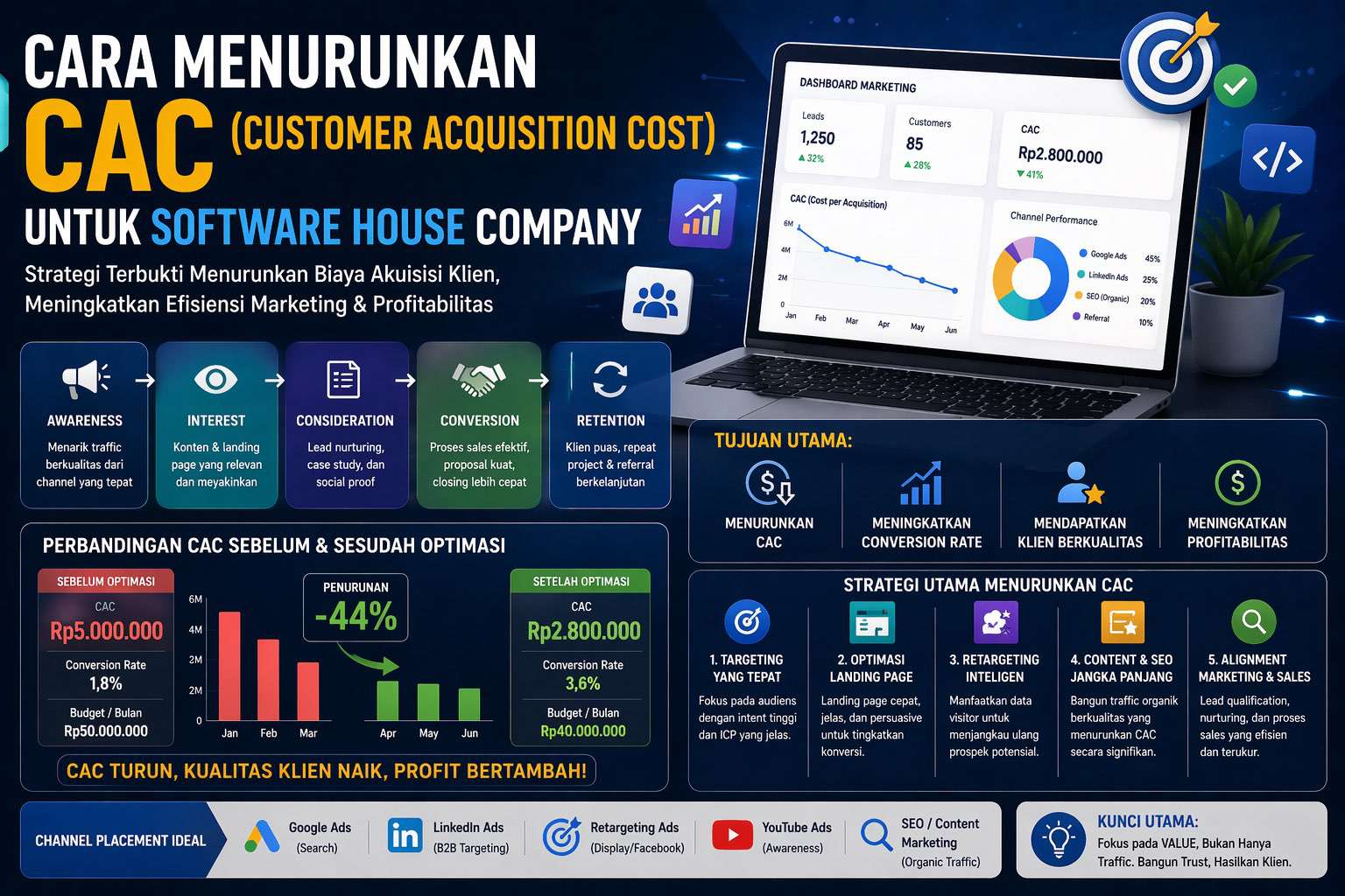 Karena siklus penjualan software house biasanya lebih panjang (high-ticket & B2B), CAC cenderung lebih tinggi dibanding bisnis lain. Oleh karena itu, optimasi harus dilakukan secara end-to-end.