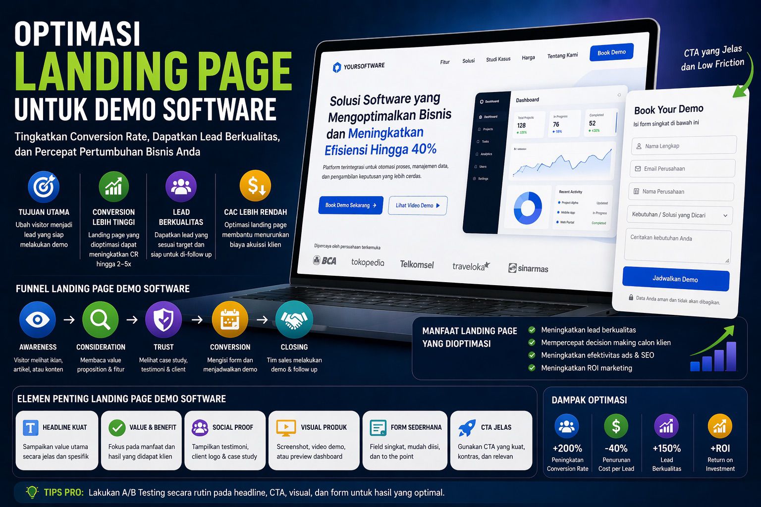 Landing page untuk demo software adalah salah satu aset paling penting dalam funnel digital marketing, khususnya untuk software house dan SaaS. Berbeda dengan website biasa, landing page memiliki satu tujuan utama: mengubah visitor menjadi lead yang siap melakukan demo.